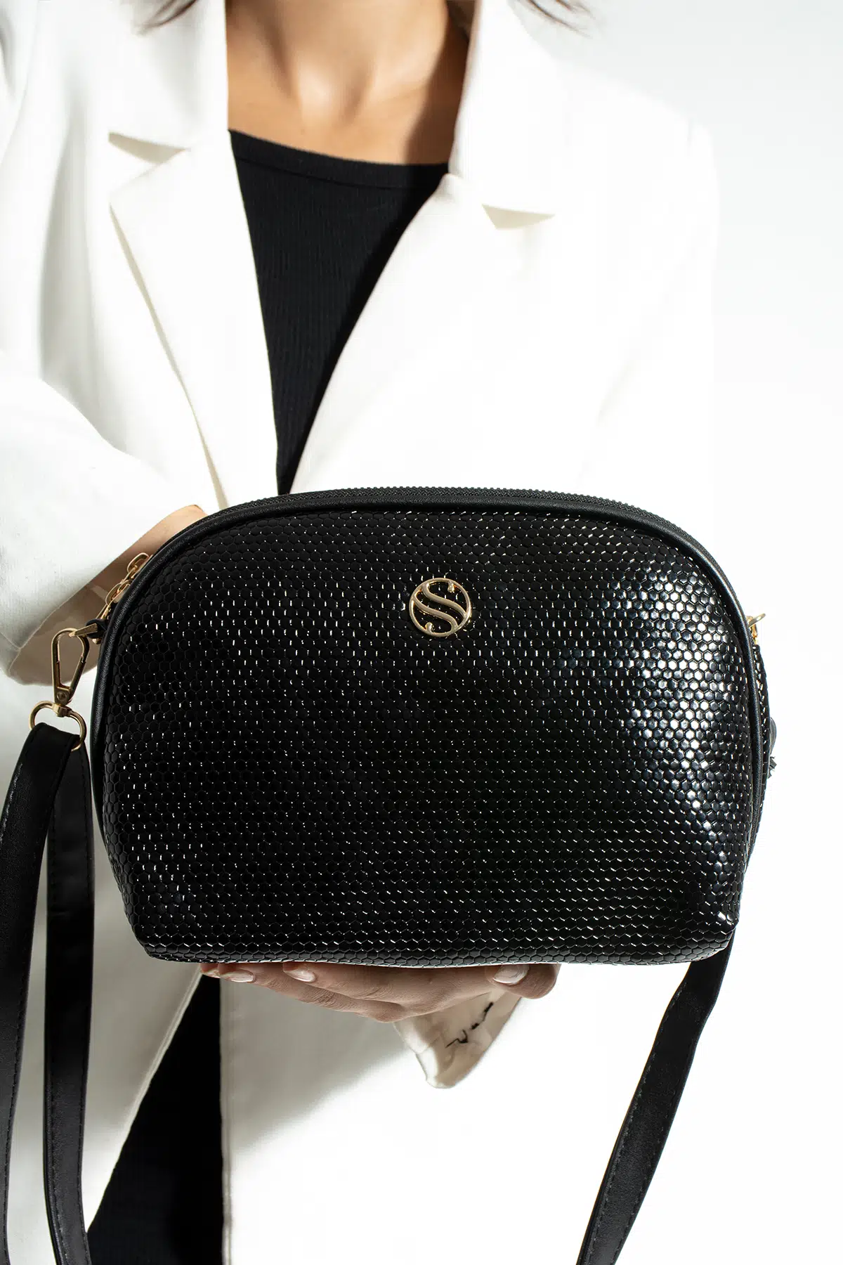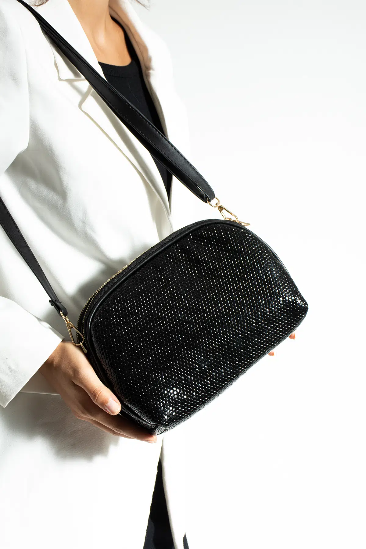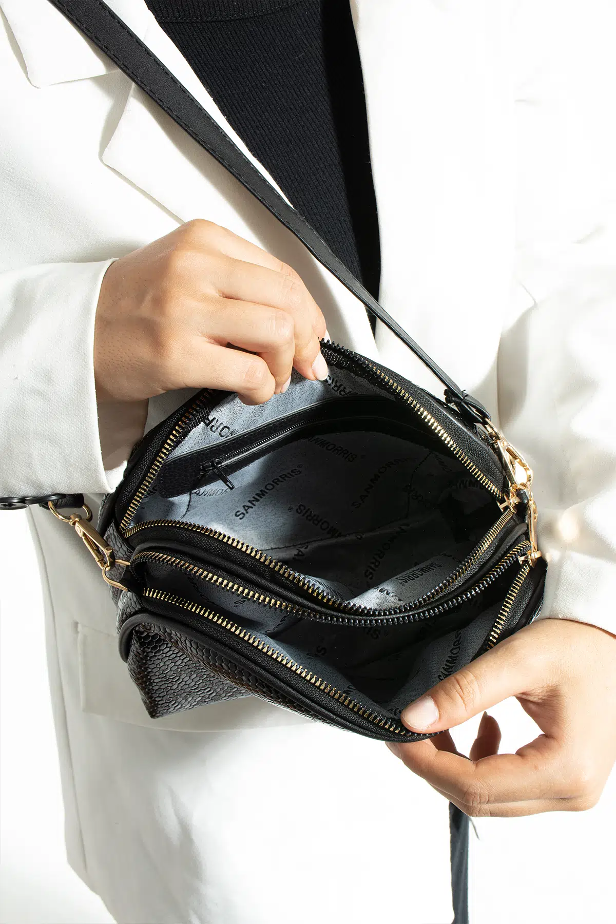 Kadın Çapraz Askılı 3 Gözlü Çift Metal Fermuarlı Gold Aksesuar Siyah Damla Omuz Çantası