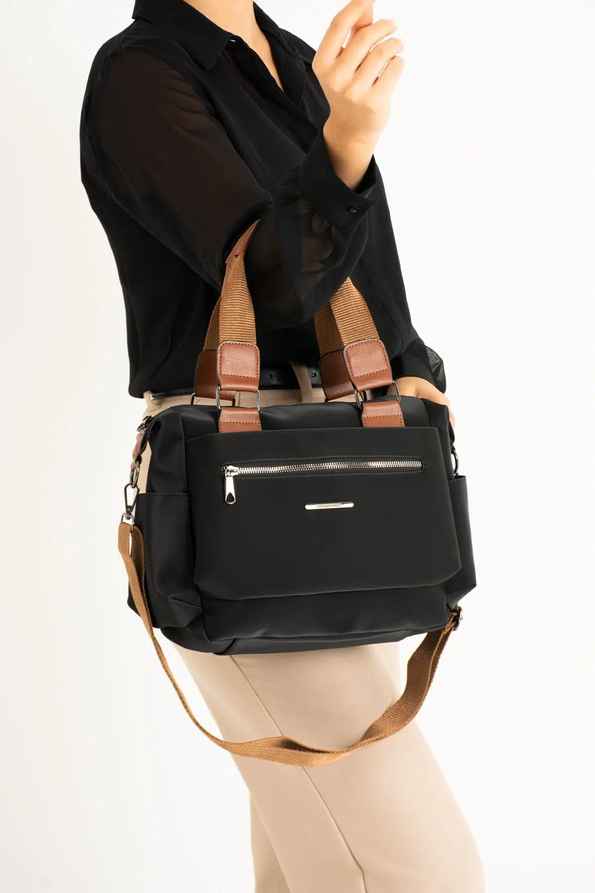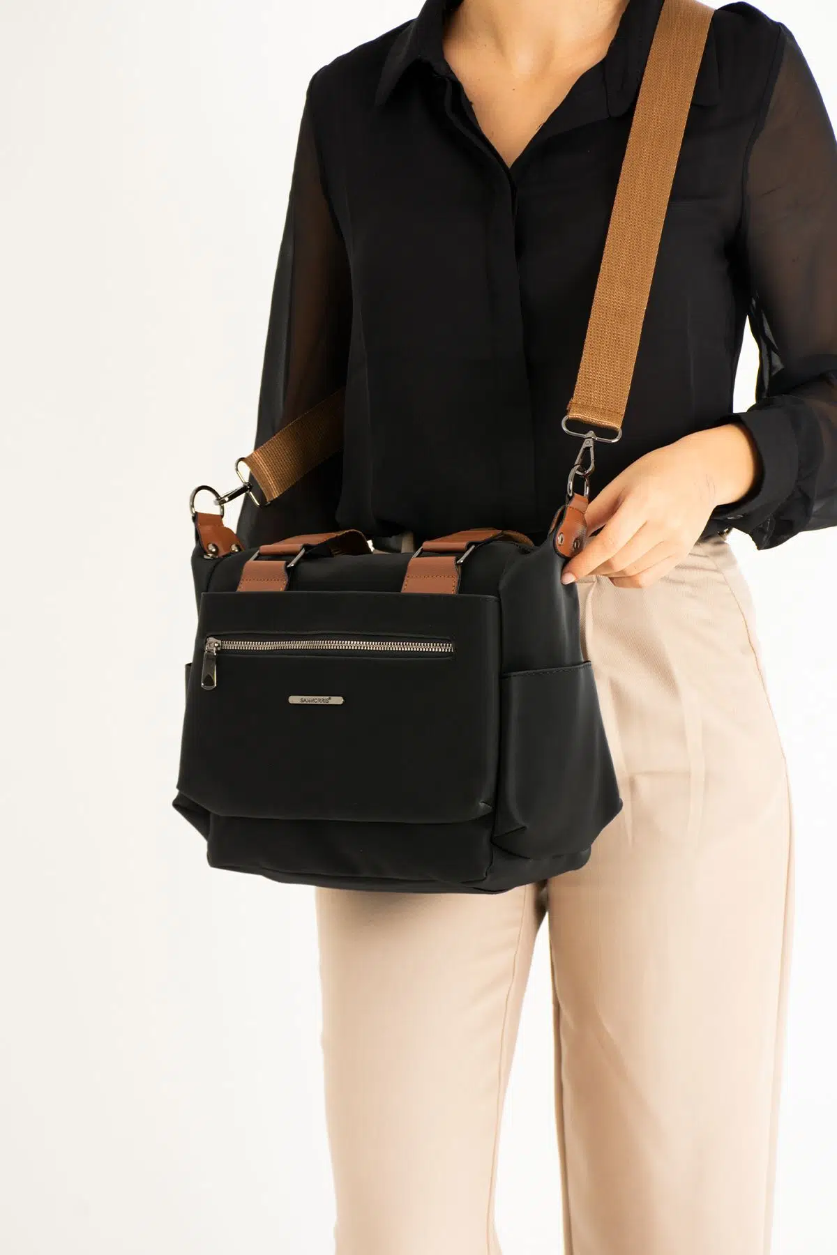 Sanmorris markalı ayarlanbilir çapraz askılı çok gözlü el ve omuz çantası modelimiz stoklarımızdadır. ; En:30cm ; Boy:22cm ; Taban Genişliği:14cm ; Yüksek kalite saten kumaş ve iç astar kullanılarak Türkiye'de üretilmiştir. Yumuşak dokulu bir kumaştır. Çapraz askısı dilediğiniz boyda ayarlanabilmektedir. Çok gözlü ve geniş iç hacmi sayesinde günlük hayatınızı kolaylaştırırken şık tasarımıyla da kombinlerinizin vazgeçilmezi olacak. Dilerseniz çapraz askısı tamamen çıkarak yalnızca el çantası olarak da kullanılabilmektedir. Temizliğini nemli bez ile yapınız. ; Kumaş kalitesi yağmur suyu geçirmez özelliğe sahip; Saten kumaş türünde bir kumaş türüdür.; Renk zeminler Siyah , askı kısımları taba renktir.