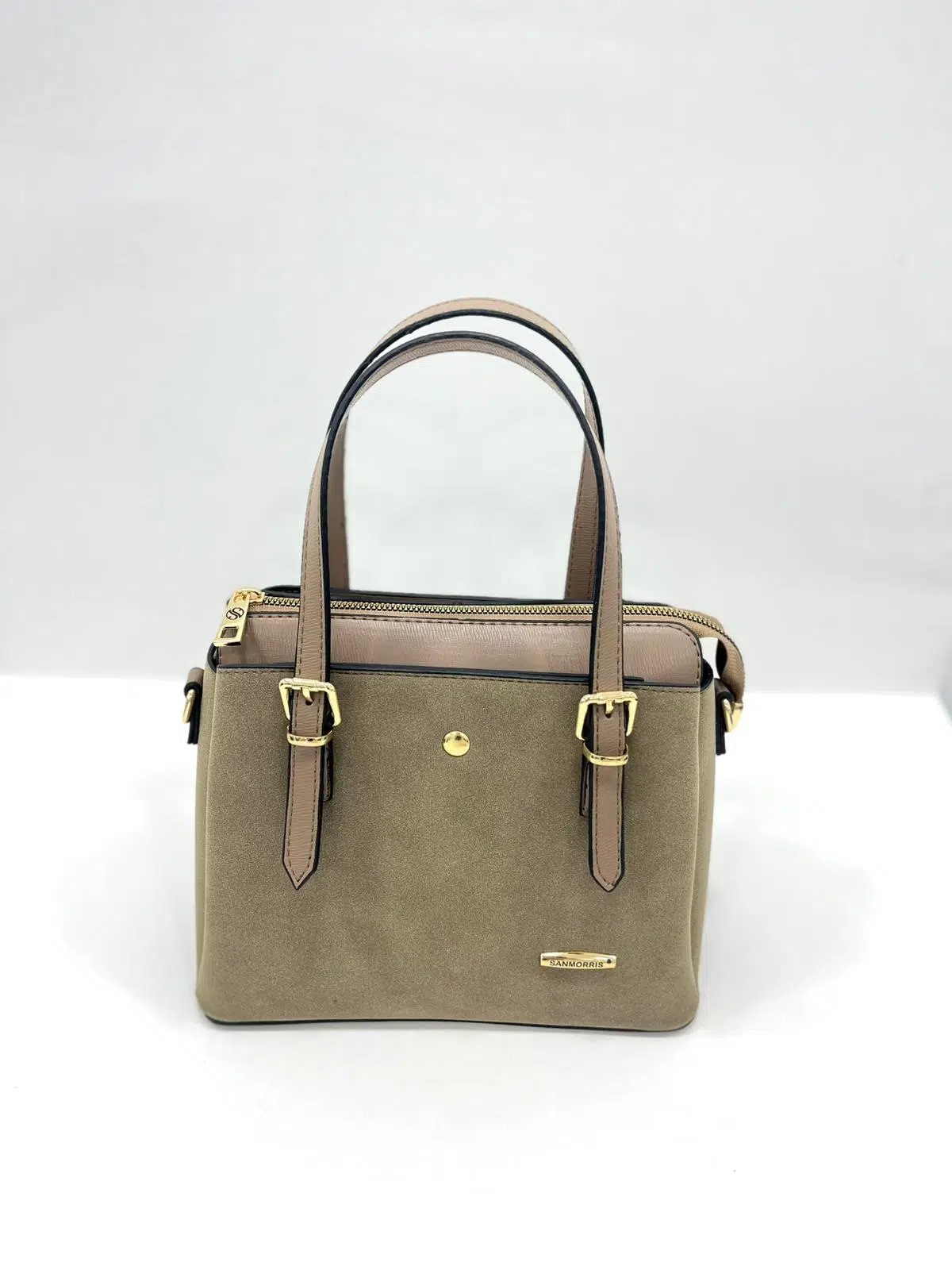 Kadın Uzun Askılı 4 Bölmeli Gold Aksesuarlı Sade Şık Haki Taba Garnili Omuz Ve El Çantası