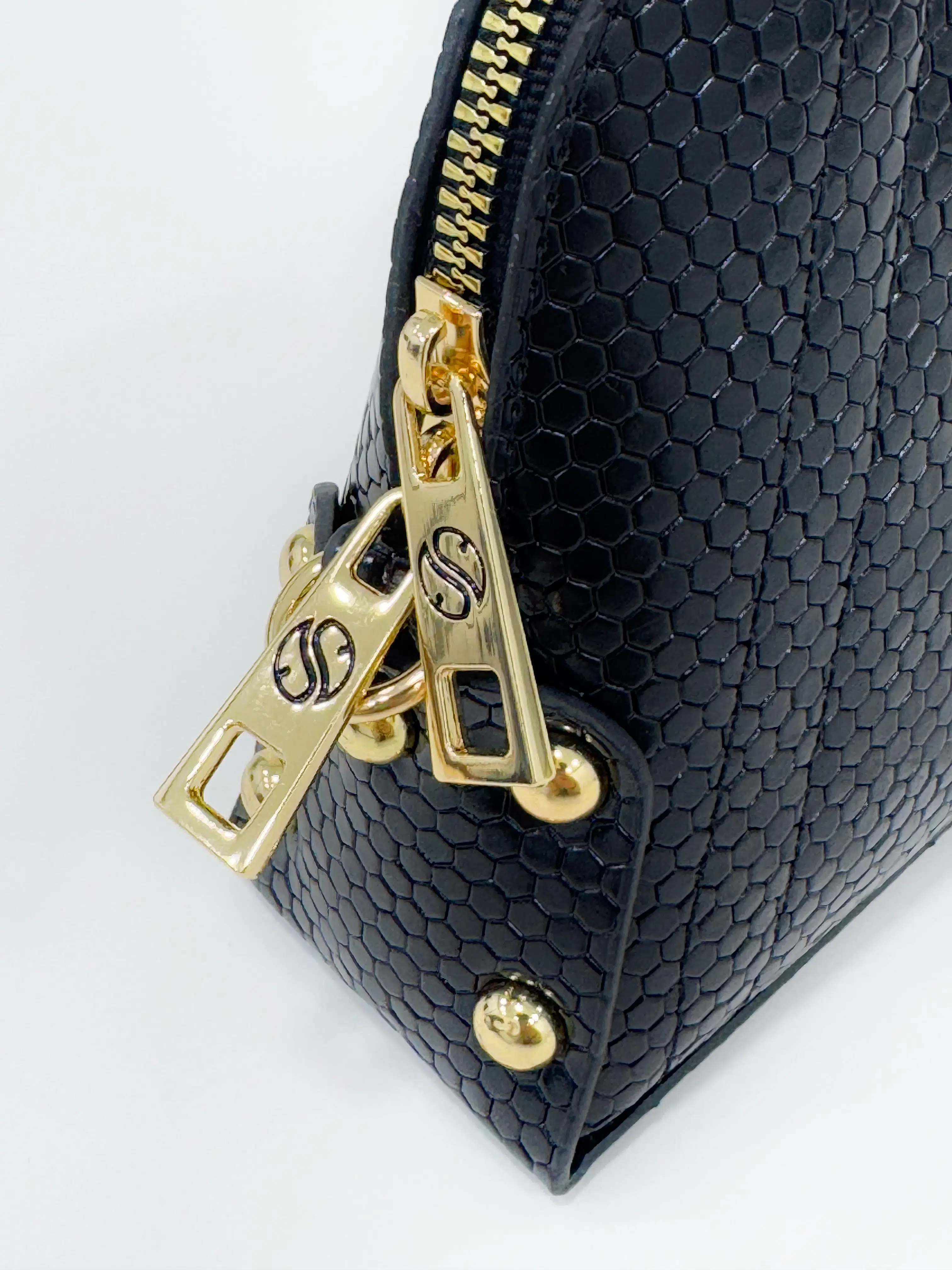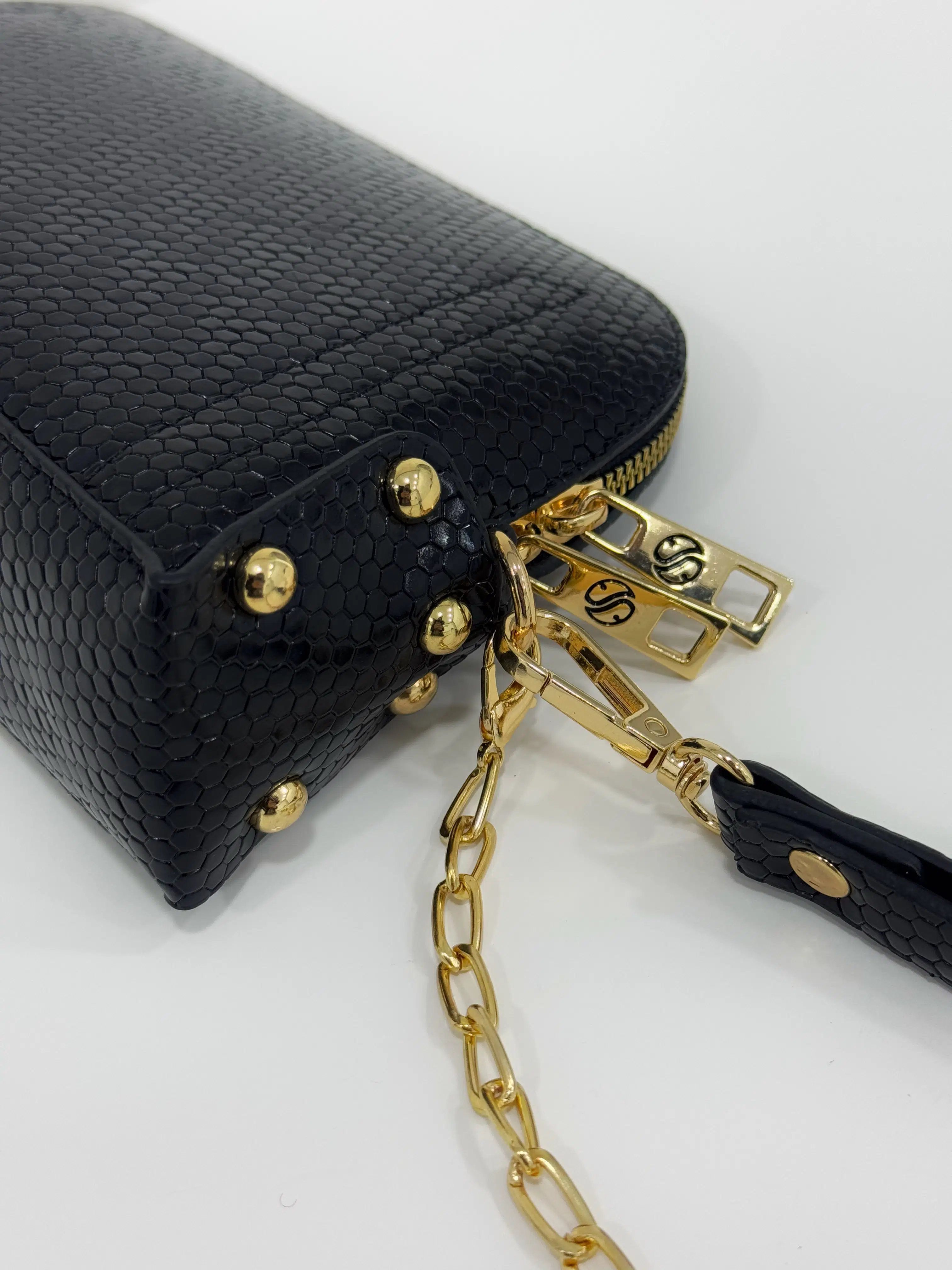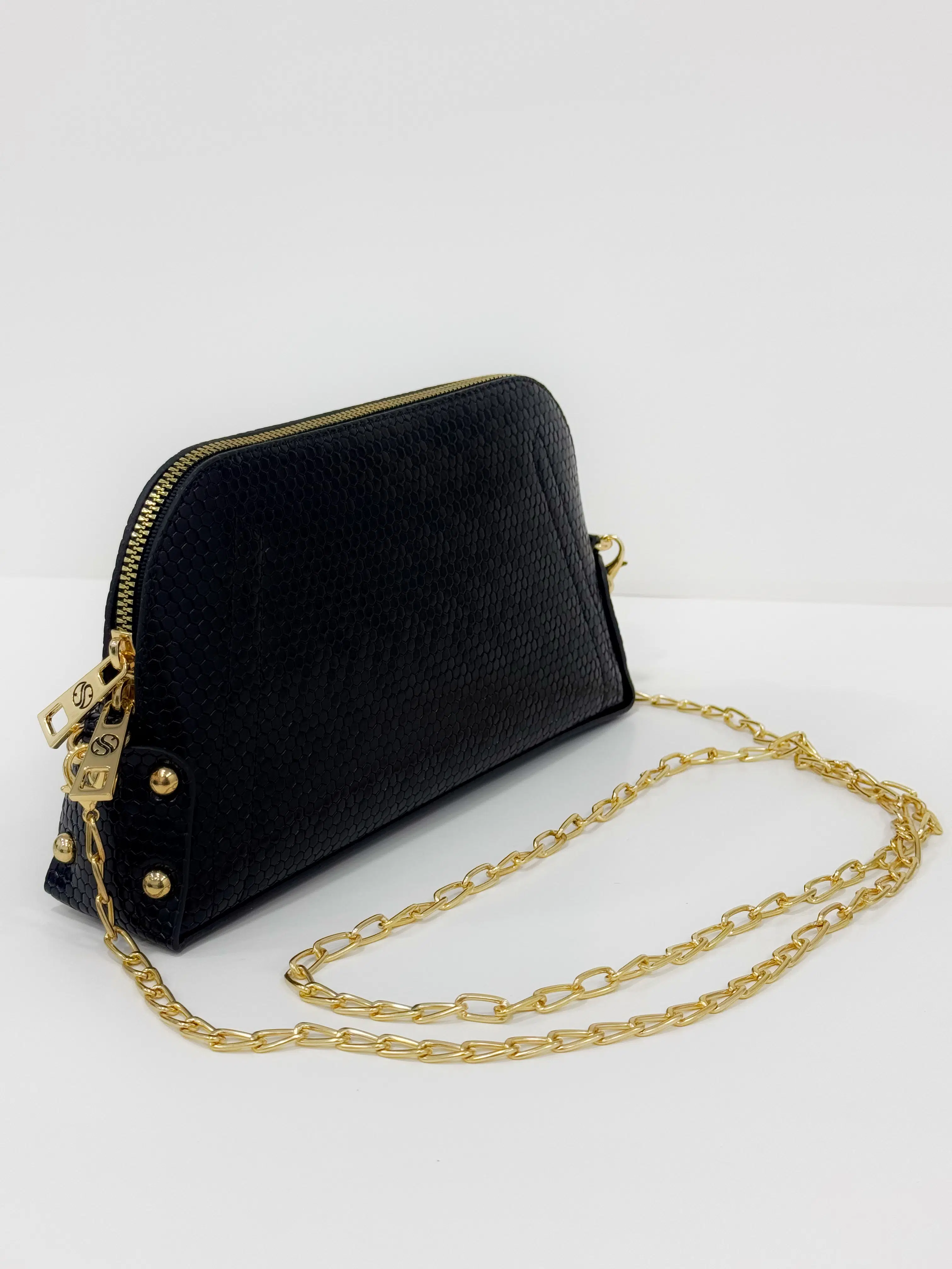 SANMORRİS ZİNCİRLİ ÇAPRAZ OMUZ ASKILI SİYAH DAMLA DESENLİ EL ÇANTASI